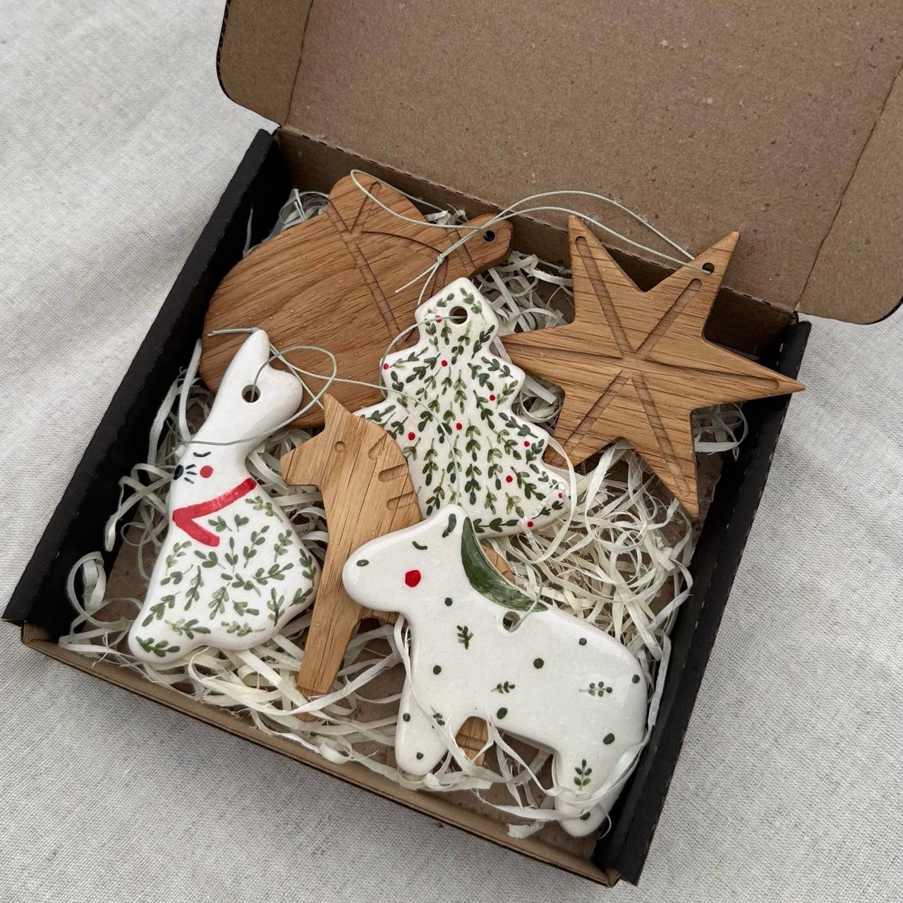Объединяя теплоту дерева и утонченную гладь керамики, этот набор создает невероятно гармоничную и стильную композицию на вашей новогодней елке. Это не просто украшения, а будущая семейная реликвия, которая будет хранить воспоминания о самых светлых праздниках.