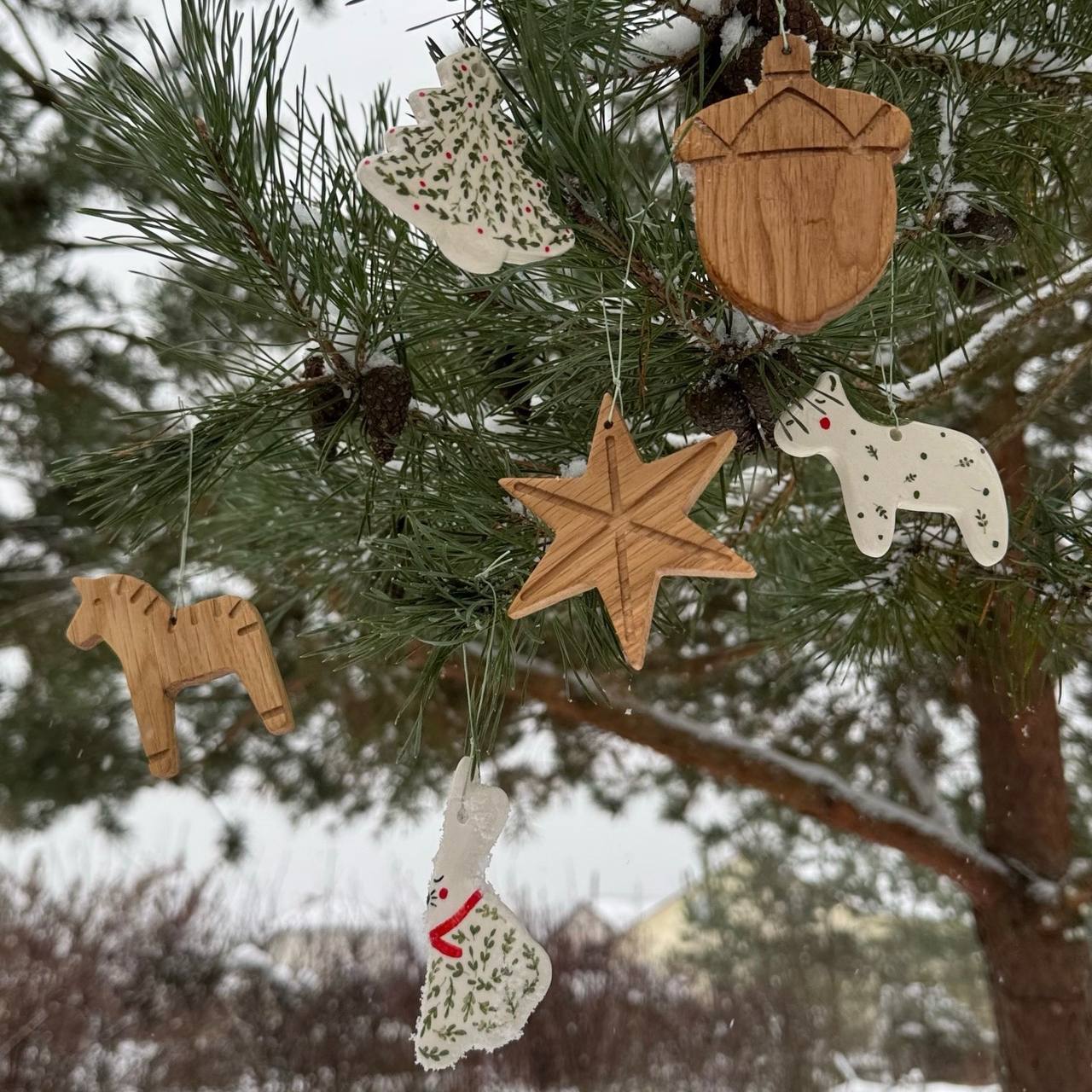 - Елочные игрушки ручной работы из массива дуба и керамики